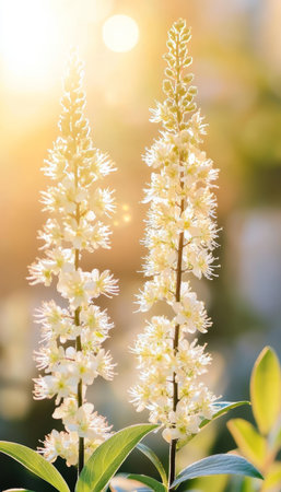 An eye-level composition displays delicate white wildflowers with textured stems and a lush backdrop of green foliage. The scene is illuminated by soft sunlight, creating a warm atmosphere. This versatile image is well-suited for various commercial applications, including editorial content and visual design projects.