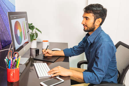 Side view. Young bearded businessman in denim shirt is sitting in office at table and is using computer with color swatch on screen. On table is smartphone and stationery. Man working