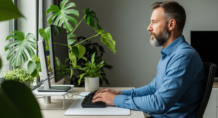 A middle-aged man with a beard sits at a desk, typing on a keyboard while looking at a computer monitor in a well-lit office space filled with lush green plants.