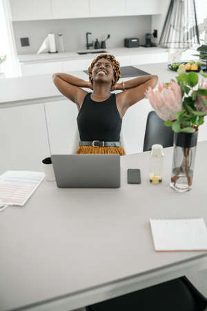 African traditional business woman working from home. Looking up, stretching and arms behind her day dreaming, wearing inspired head scarf