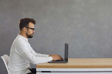 Portrait of a side view of a man at a table with a laptop prints, on a black background. A man with a beard in glasses and a white shirt is typing on a laptop