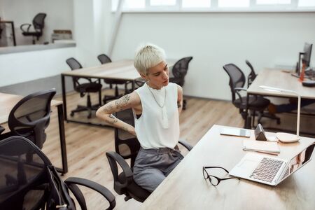 Backache. Young beautiful tattooed businesswoman with short haircut suffering from back pain while sitting at office desk in modern office. Working in office