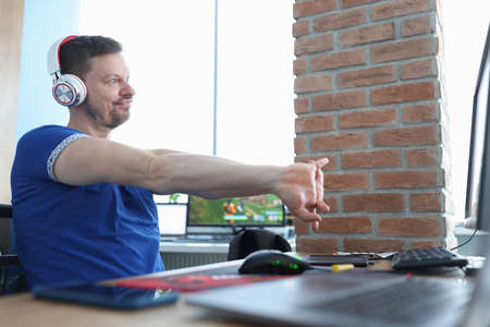 Male gamer sits in headphones and looks upset at monitor. How to play at high level in online games concept