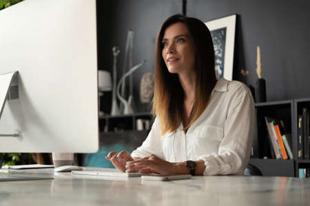 Business woman using computer at workplace in modern office. Brunette secretary or female lawyer smiling and looks happy. Working for pleasure and success