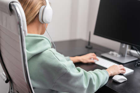 Woman working on keyboard and computer. Freelancer doing her work at home. IT specialist writing letter or coding program on two screens. Copy space