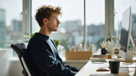 Young businessman is working on computer in office, sitting at desk near window, healthy posture concept
