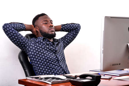 portrait of a young businessman is sitting in his office having a break while working with the computer and holding his hands behind his head