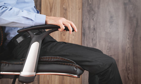 Male hand adjusts office chair.