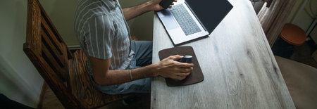 The man working from home. Close up at the hand and ergonomic computer mouse. Working during COVID-19 concept.