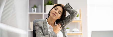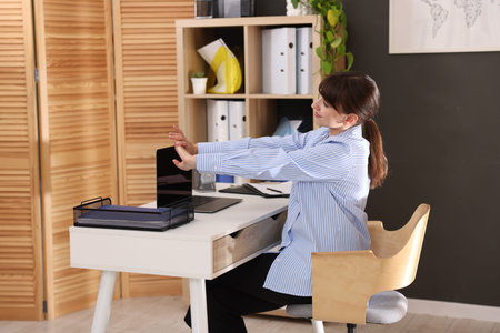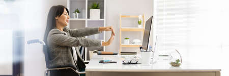 Woman Stretching At Office Desk. Worker Stretch Workout