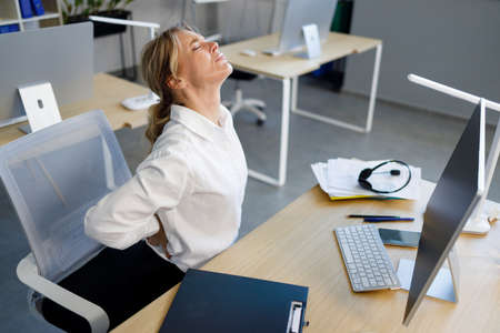 Middle aged businesswoman having back pain while sitting at office desk