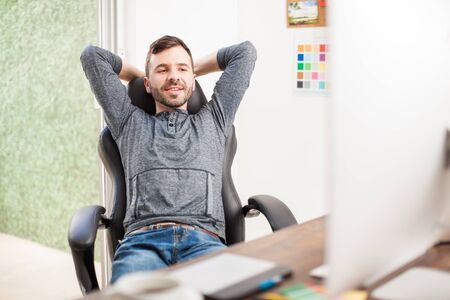 Portrait of a good looking young man leaning back on his chair and relaxing at his office