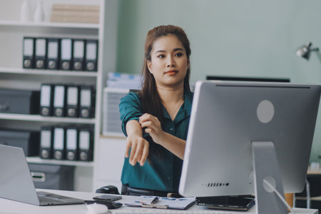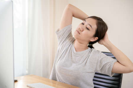 Young Asian woman having an office syndrome health problem after overworking for a long time. Asian working woman suffer injury at her neck. Discomfort work place make people uncomfortable.