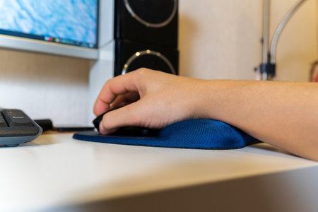 Hand with silicone gel wrist support mouse pad for desktop computer. Selective focus