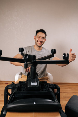 Cheerful young man assembling new office chair from flat-pack furniture at home, smiling looking at camera and giving thumbs up gesture, celebrating success in diy construction project.