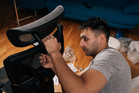 Focused man struggling while assembling office chair at home, feeling frustrated with diy furniture construction, concentrating on complex instructions for home improvement project.