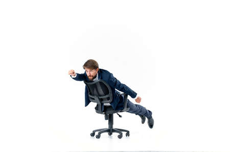 Cheerful man rides in a chair office manager studio