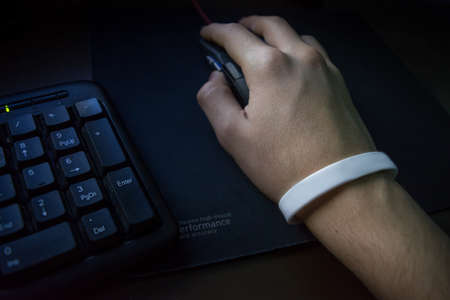 Male hand with bracelet holding computer mouse