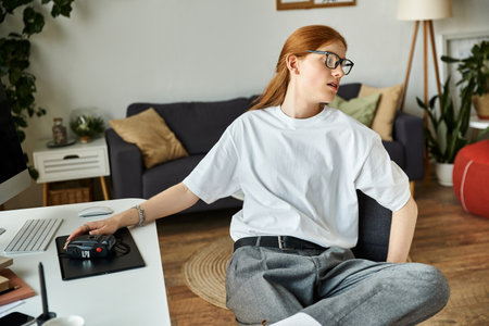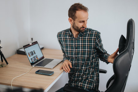 Man working remotely at home, adjusting ergonomic office chair
