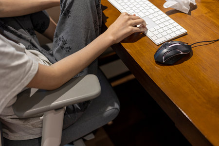 Businesswoman working on a computer from home during pandemic to prevent disease. remote work. Hands, mouse, keyboard. Cropped shot of woman typing on keyboard and working with desktop computer