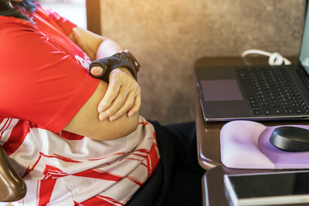 Man works on computer wears back support belt on lower back to relieve stress on spine has hernia.