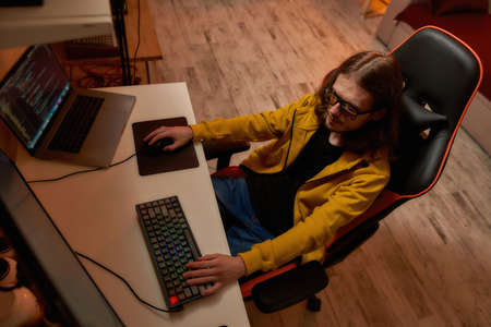 Brunet short-haired nerd man addicted to games plays for long time sitting at computer monitor in gaming chair at wooden table at semi-darkness.