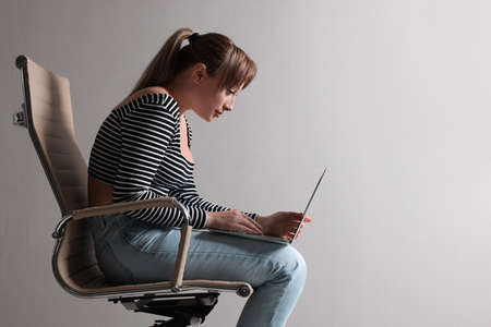 Young woman with poor posture using laptop while sitting on chair against gray background, space for text