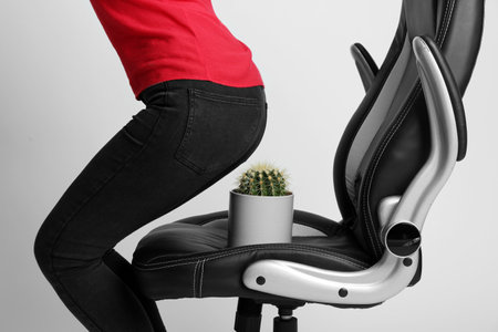 Woman sitting down into armchair with cactus on white background, closeup. Hemorrhoid concept
