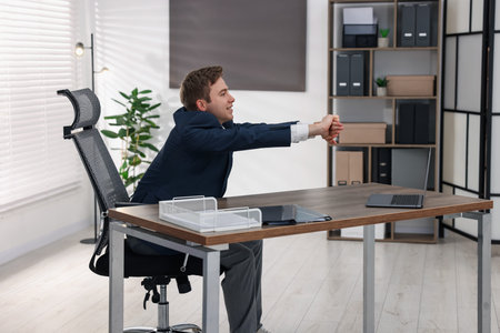 Young businessman stretching his arms at table in office
