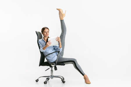 Portrait of woman, office worker standing on chair in ballet pose and reading from tablet isolated over white background