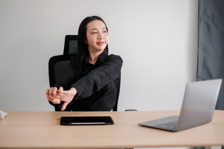 Young entrepreneurial Latin woman in office sitting at her desk, doing arm stretches during break, sitting in black chair with white desk with laptop, mouse, phone and notebook on table
