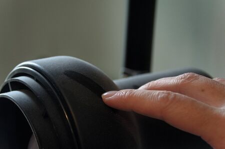 Caucasian finger drawing a straight line through the dust on a black lamp light.