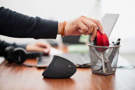 The man using black vertical optical computer mouse with ergonomic design and leave normal computer mouse in the basket.