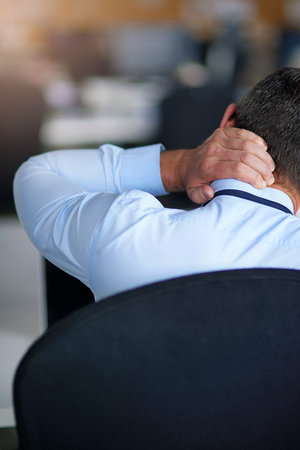 He needs some stress management. a businessman suffering from neck pain.