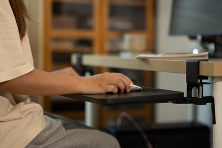 Cropped shot of woman working at a desk, using computer mouse on retractable tray.
