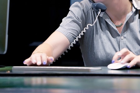 Close-up of an office worker. Woman secretary answering phone calls and talking with customers, she is sitting at her desk working.