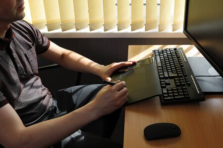 A man works focused on a graphics tablet in front of a computer monitor. Close up side view