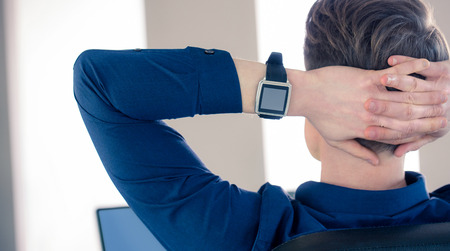 Rear view of businessman wearing smartwatch in his office
