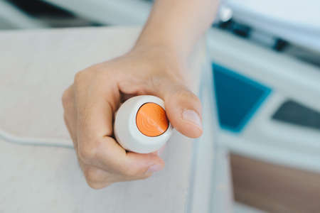 Close up of patient hand pressing emergency button in hospital ward for calling nurse or health care staff. The call button can be used by a patient to call for another when such assistance is needed.