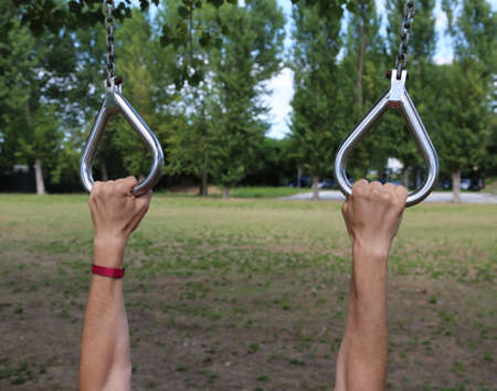 athlete's hands grasping the gymnastic rings firmly during outdoor training