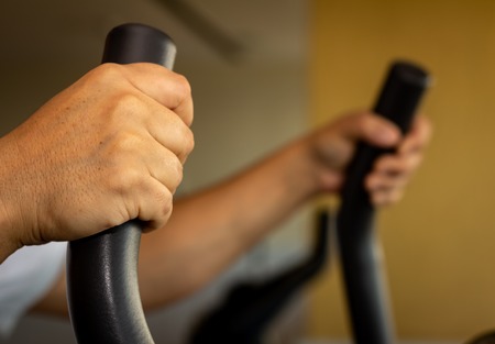 Training on a sports bike in the gym, hand close-up holding the handle of the bike, man