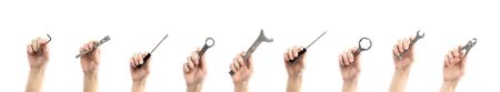 Hand holds a different tool. Screwdrivers and wrenches. Close up. Isolated on a white background.