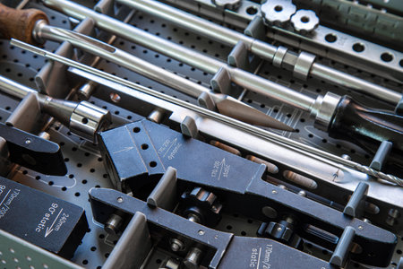 Oblique view of a set of medical tools in the toolbox before spinal surgery.