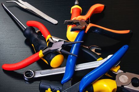 Screwdrivers and pliers, tools on a black wooden table close up