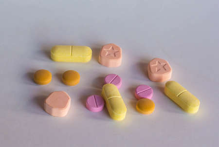 A pile of medical pills on a gray-pink background. Medications. Selective focus.