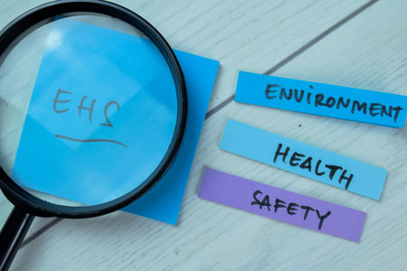 Concept of EHS - Environment Health Safety write on sticky notes isolated on Wooden Table.
