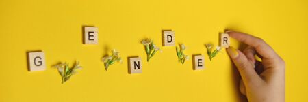 Word gender depicted by using wooden blocks and flowers on yellow bee background with woman hand pointing on it
