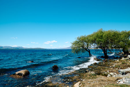 rocky shore with green vegetation near a blue lake, on the horizon a landscape of mountains with peaks covered with snow, Bariloche National Park