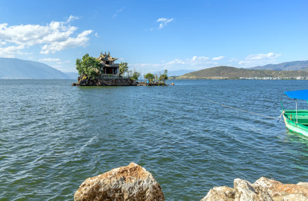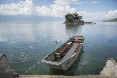 Boat docking in the lake, in the background a house on a small island. Area of Dali, Yunnan, China