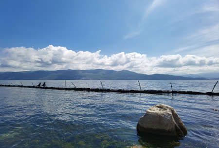 Calm and tranquil water of lake Pamvotida near the Greek town of Ioannina, early spring morning with fog, selective focus, landscape view from Ioannina Island with the town in the background far away